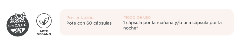 Suplementa dietas insuficientes, consulte a su médico y/o nutricionista. No consumir en caso de embarazo, lactancia, ni en niños. Consumir este producto de acuerdo con las recomendaciones de ingesta diaria establecidas en el rótulo. El consumo de suplementos dietarios no reemplaza una dieta variada y equilibrada. Su consumo debe realizarse bajo control médico. Mantener en un lugar fresco y seco, fuera del alcance de los niños. No exponer a temperaturas mayores a 25 °C